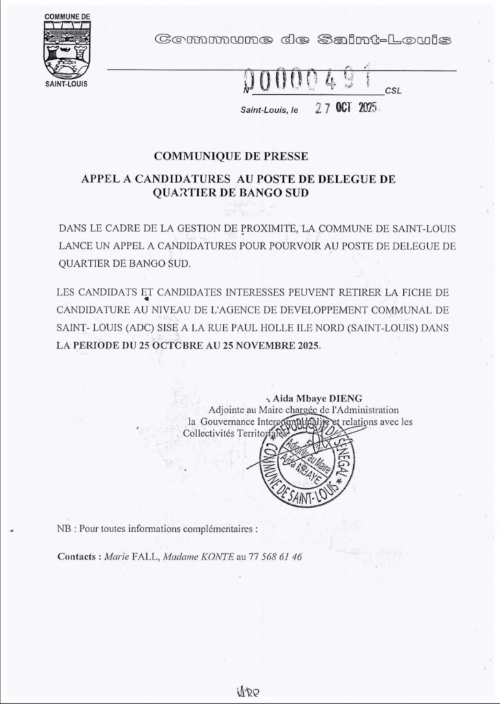 APPEL À LA CANDIDATURE AU POSTE DE DÉLÉGUÉ DE QUARTIER DE BANGO SUD - lavilledesaintlouis.sn